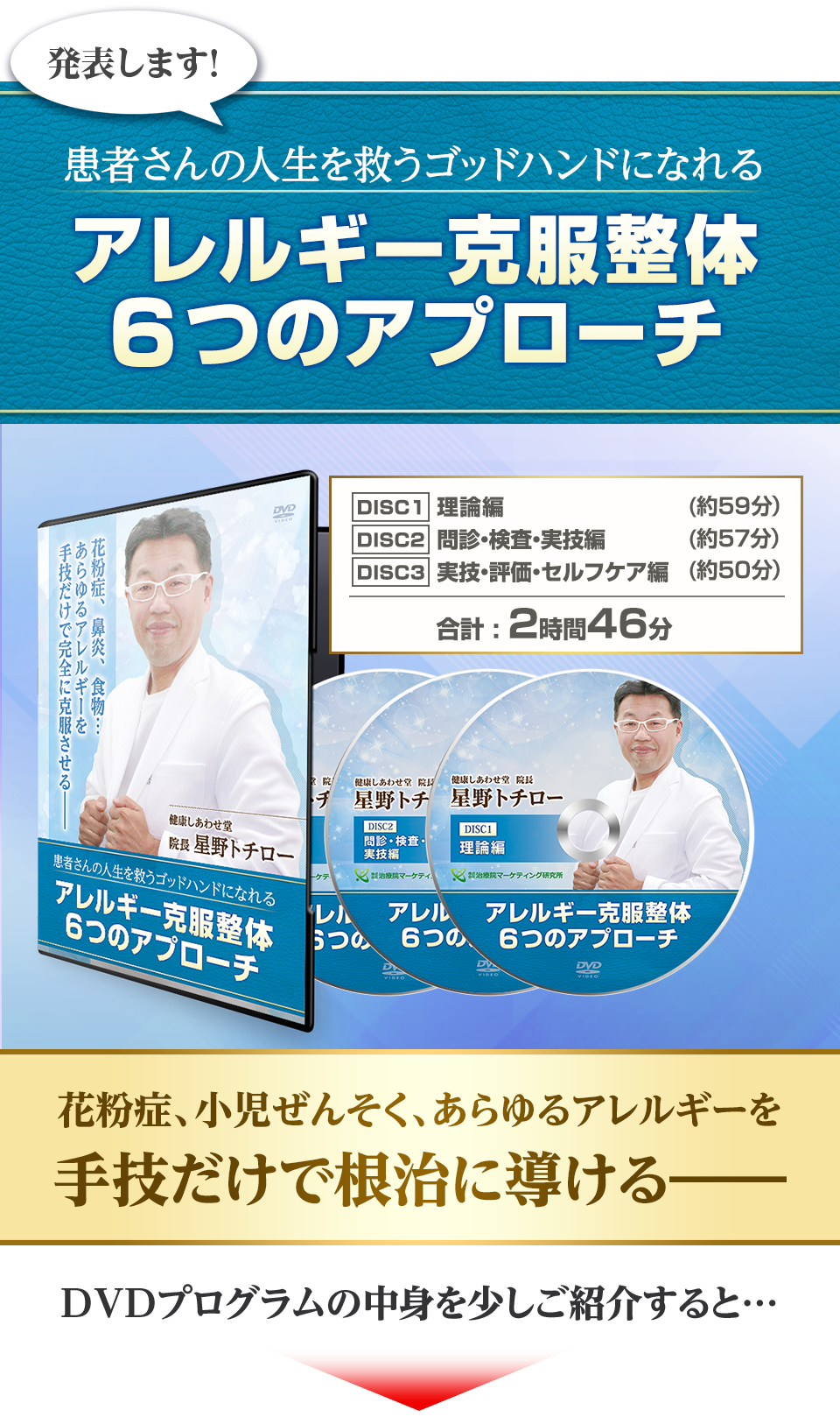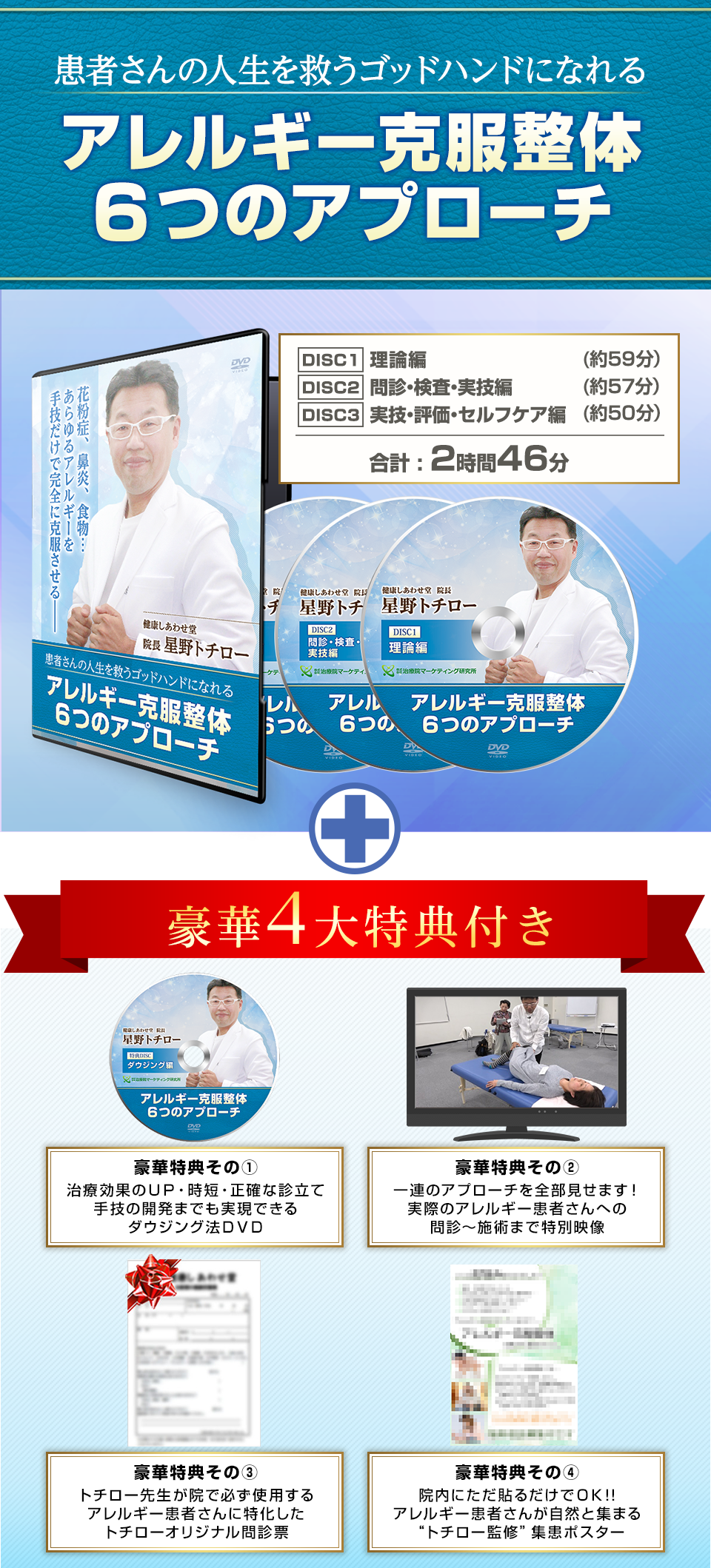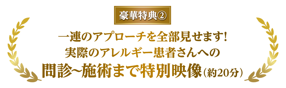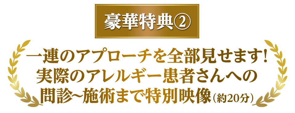 本編DVDと併せてご覧になることで、技術をより早く先生自身の施術として落とし込み、アレルギー患者さんに結果を出してあげられるようになるでしょう。