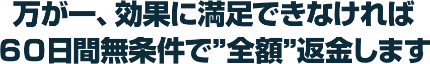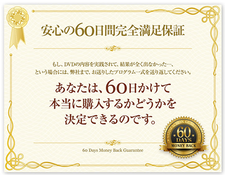 DVDをお手に取っていただき、今よりも技術的なスキルが上がらない、または実践したにも関わらず効果がみられないということであれば、 弊社の商品配送日から60日以内(必着)であれば、無条件で全額返金させていただきます。