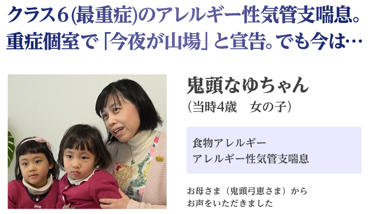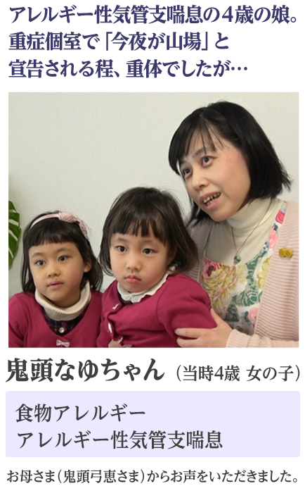 立つことも歩くことも出来ないひどい喘息の発作も、10分後には私の目の前で発作を止めてくださいました。本当に驚きました。これまで喘息の発作の度に入院を繰り返し、大量のステロイドの点滴に娘の身体が心配で怖くて泣いて、、、
