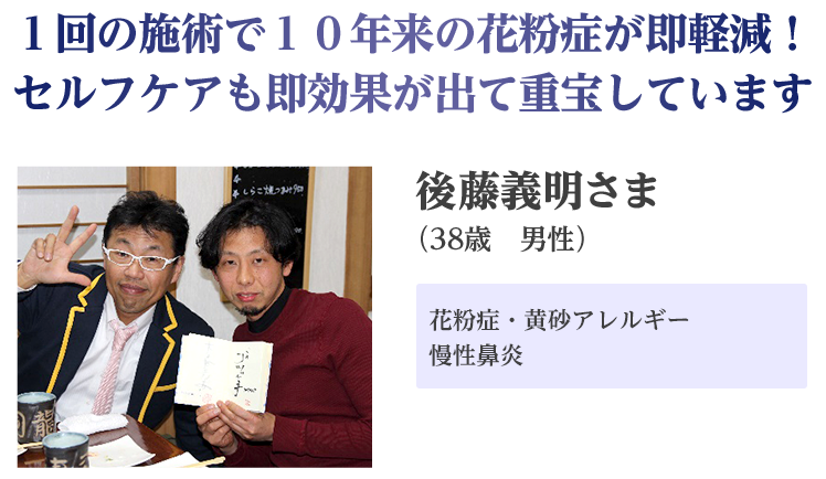 今では、花粉症や鼻炎の症状は全く出ません。黄砂も特に多い年はさすがに鼻炎ぽくなりますが薬も使わず、症状もとっても軽いので助かっています。セルフケアの回数を増やすと途端に治まりますしね!
