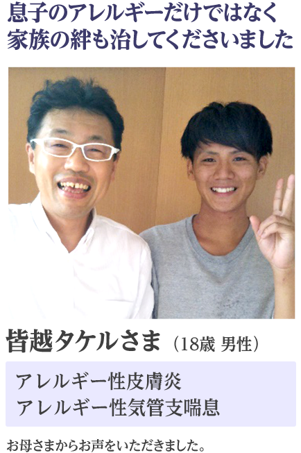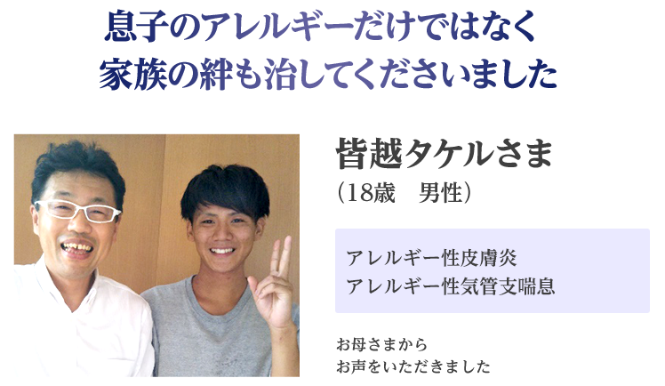 今では、当時からは考えられない程、タケルのアレルギーは治まり、今は就職の関係で離れて住んでいますが、不登校だったあの頃からは信じられない程、今の生活を楽しんでいるそうです。