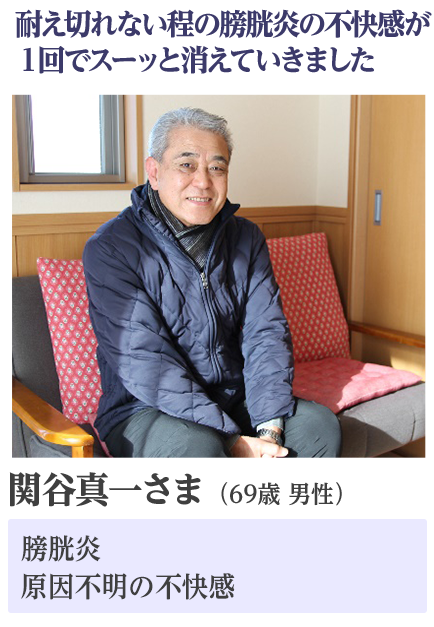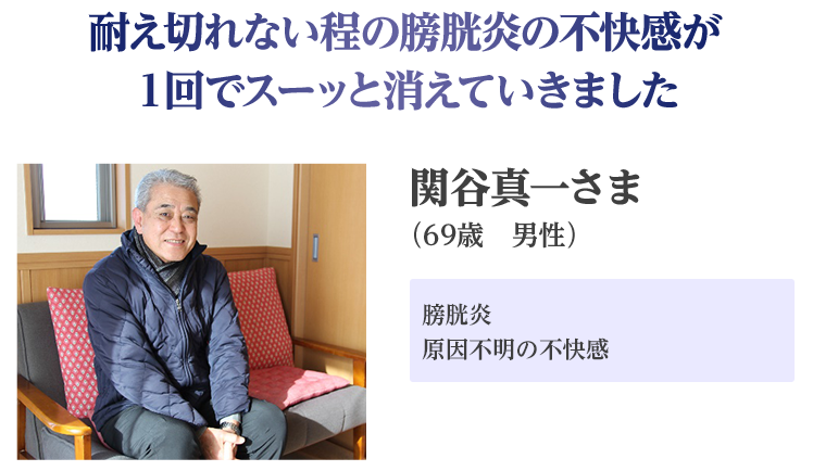60歳に市役所を定年退職となり、2年程経過した時に、下半身の膀胱付近に耐えられない程の不快感に悩まされるようになりました。
