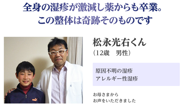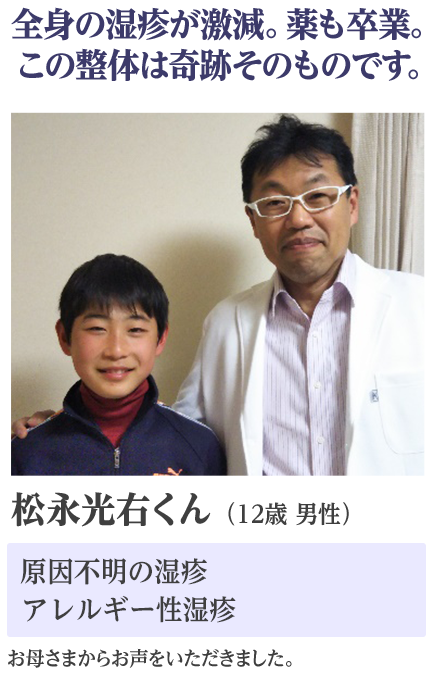 これまで、アレルギーの改善は薬を使用するしかないという対応に、疑問と限界を感じていた私は、一筋の光を感じてトチロー先生にお世話になりました。